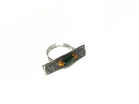 Sterling silver ring with yellow opal and pyrite Swarovski crystals.