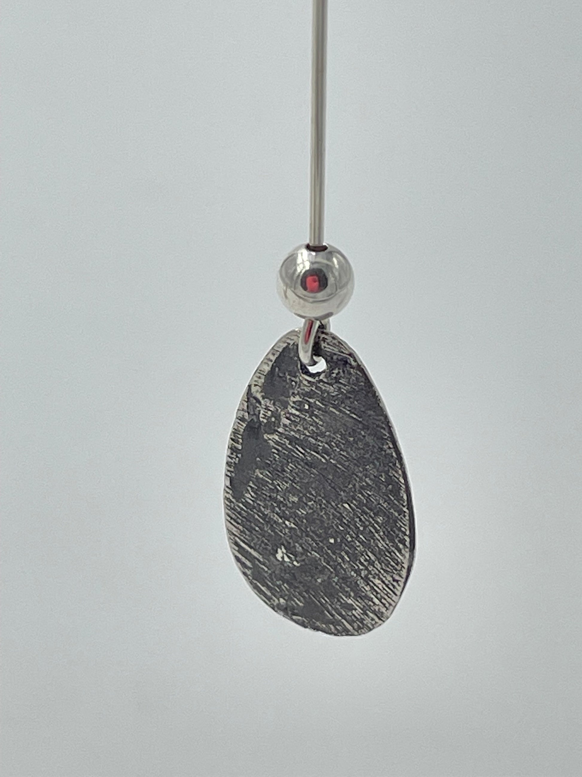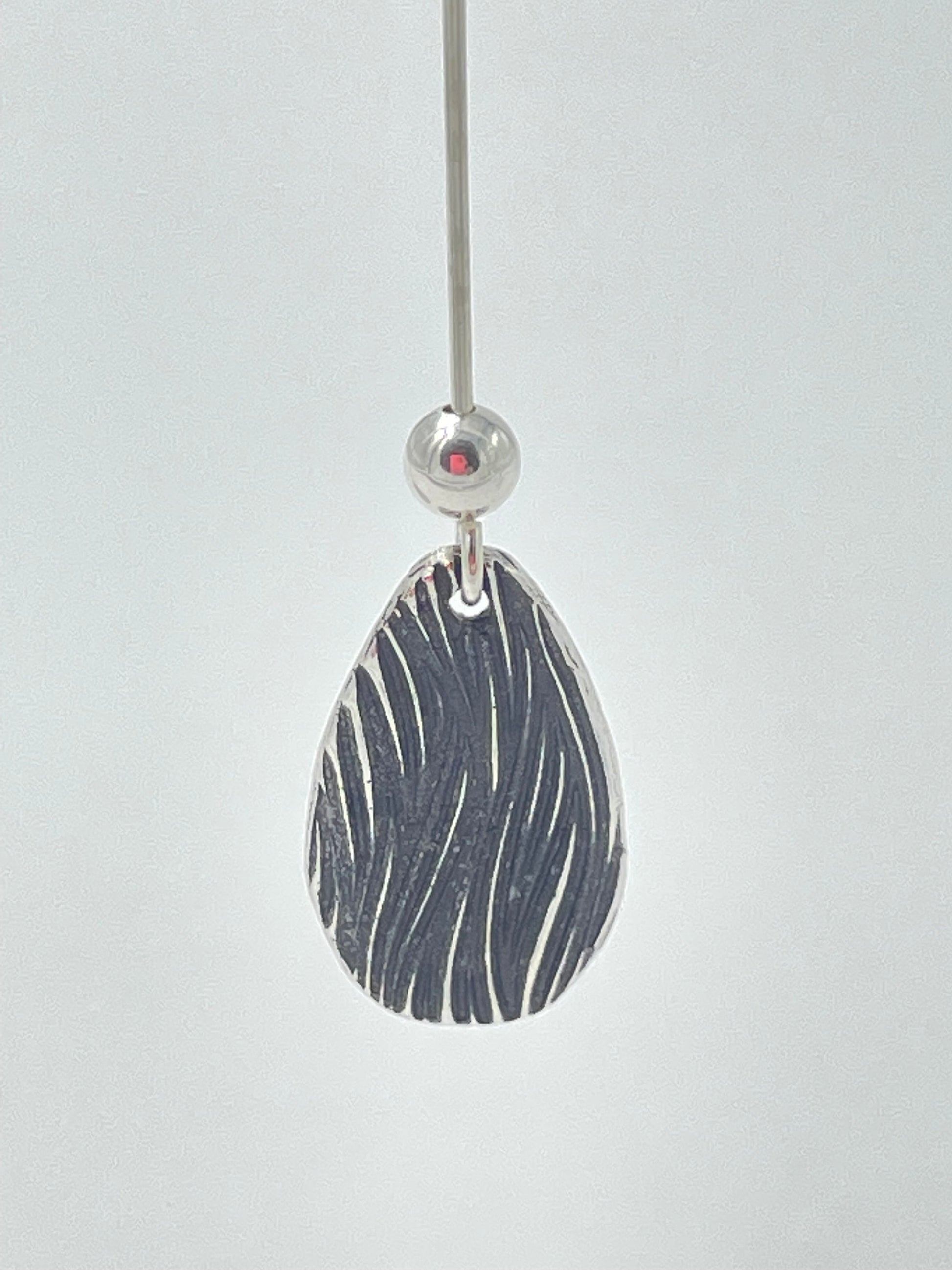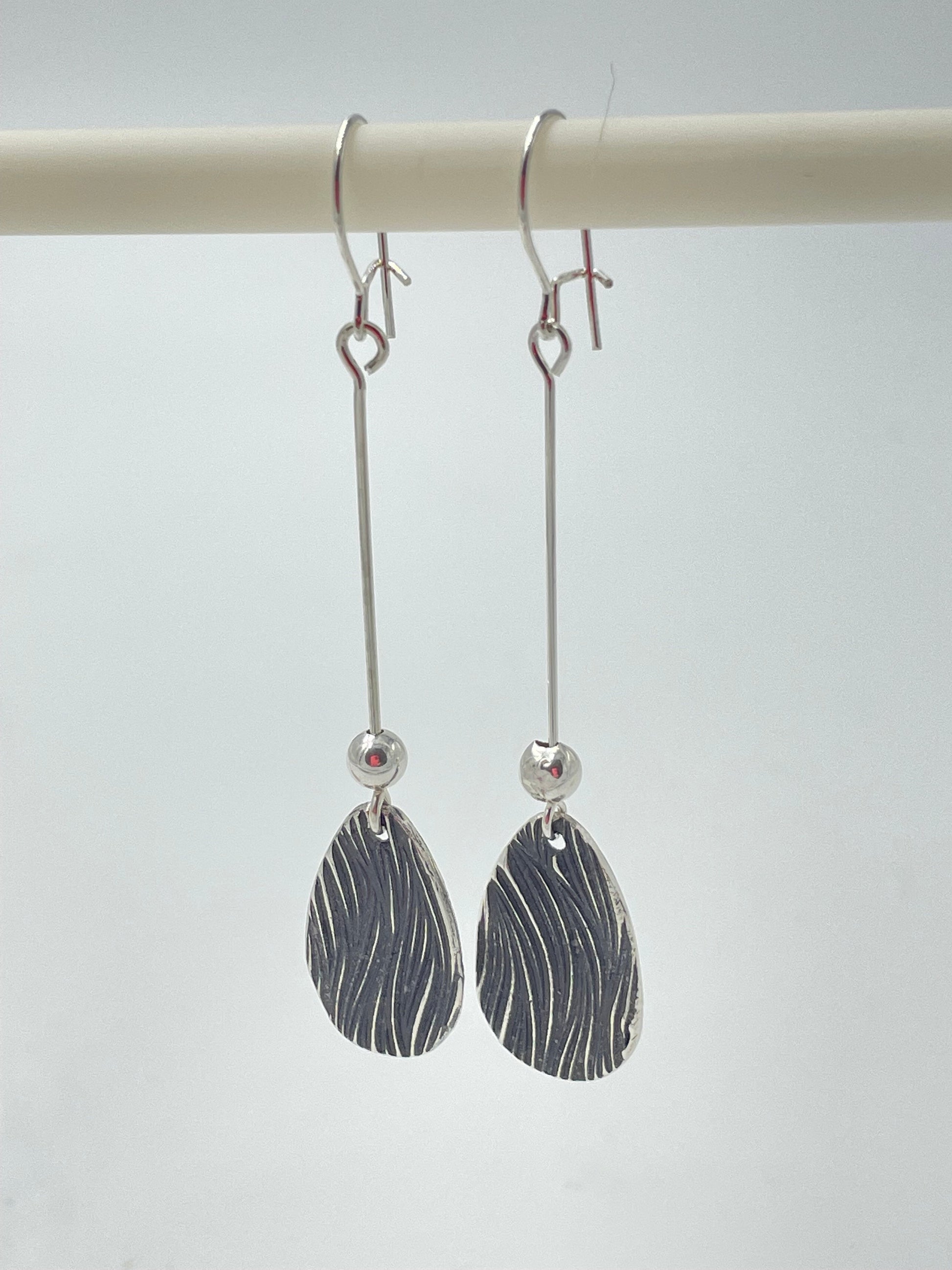 These drop earrings display a handmade silver teardrop embossed with a wave pattern. A shiny silver bead provides texture contrast. They measure 2.5” (from ear piercing to end).