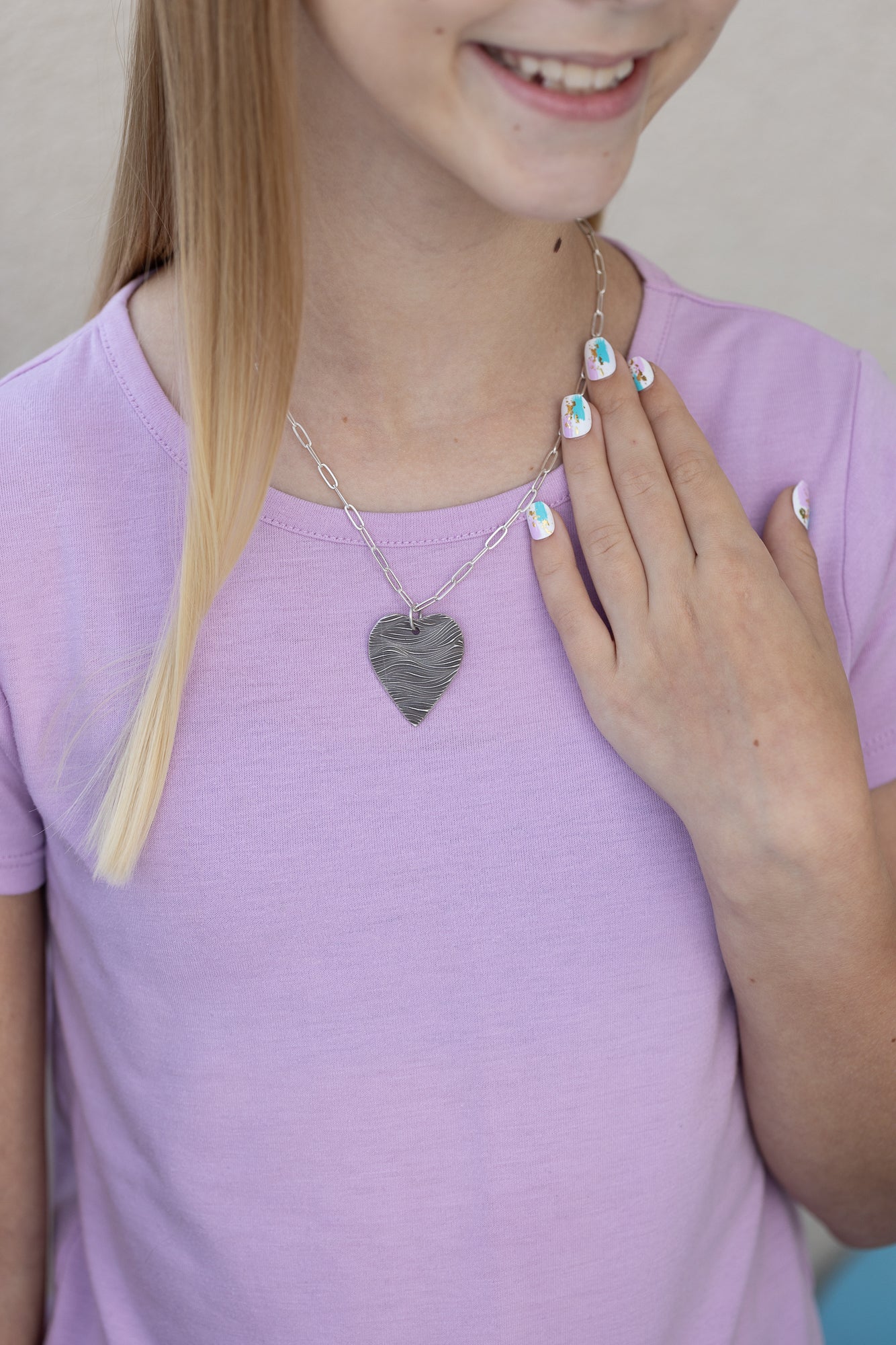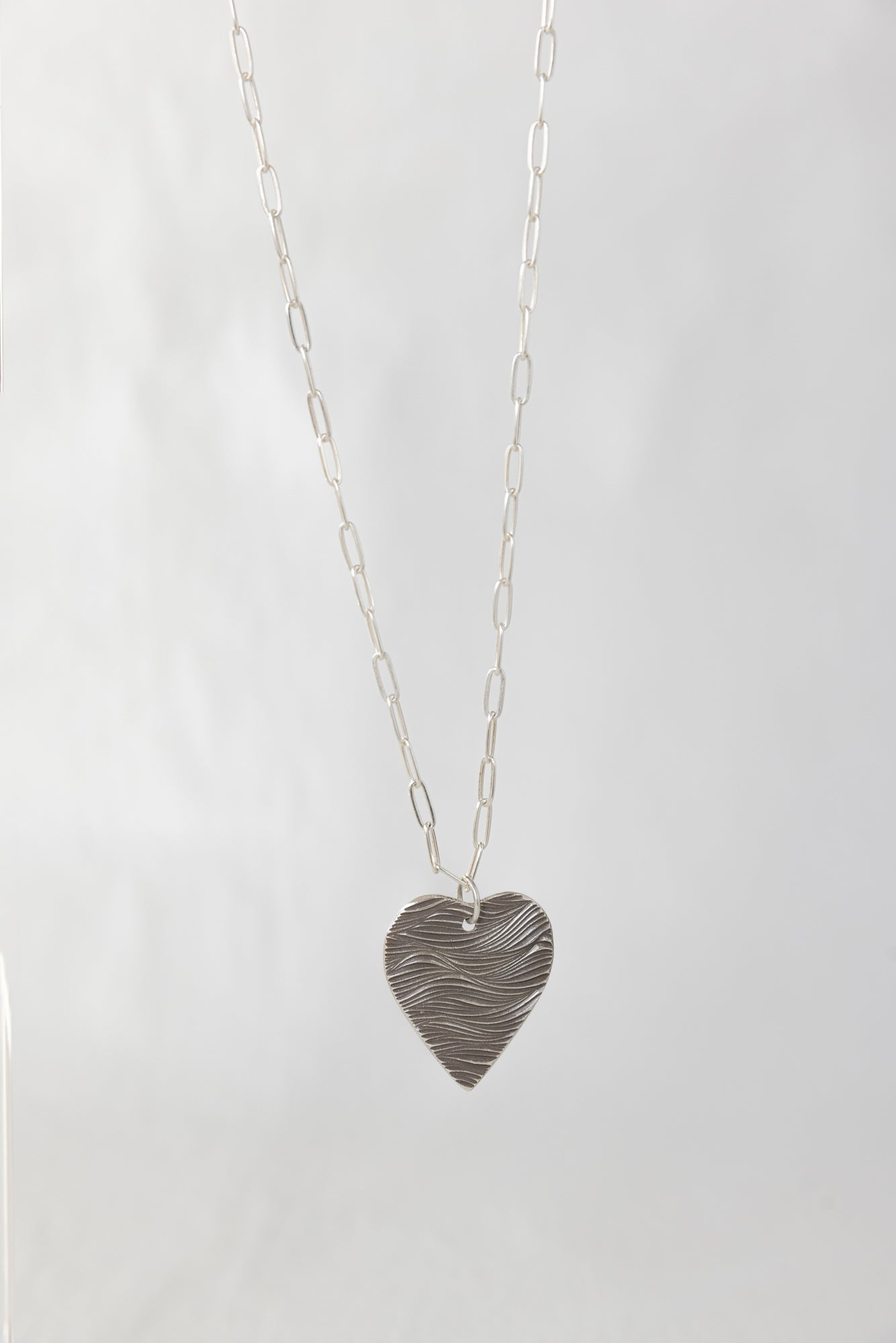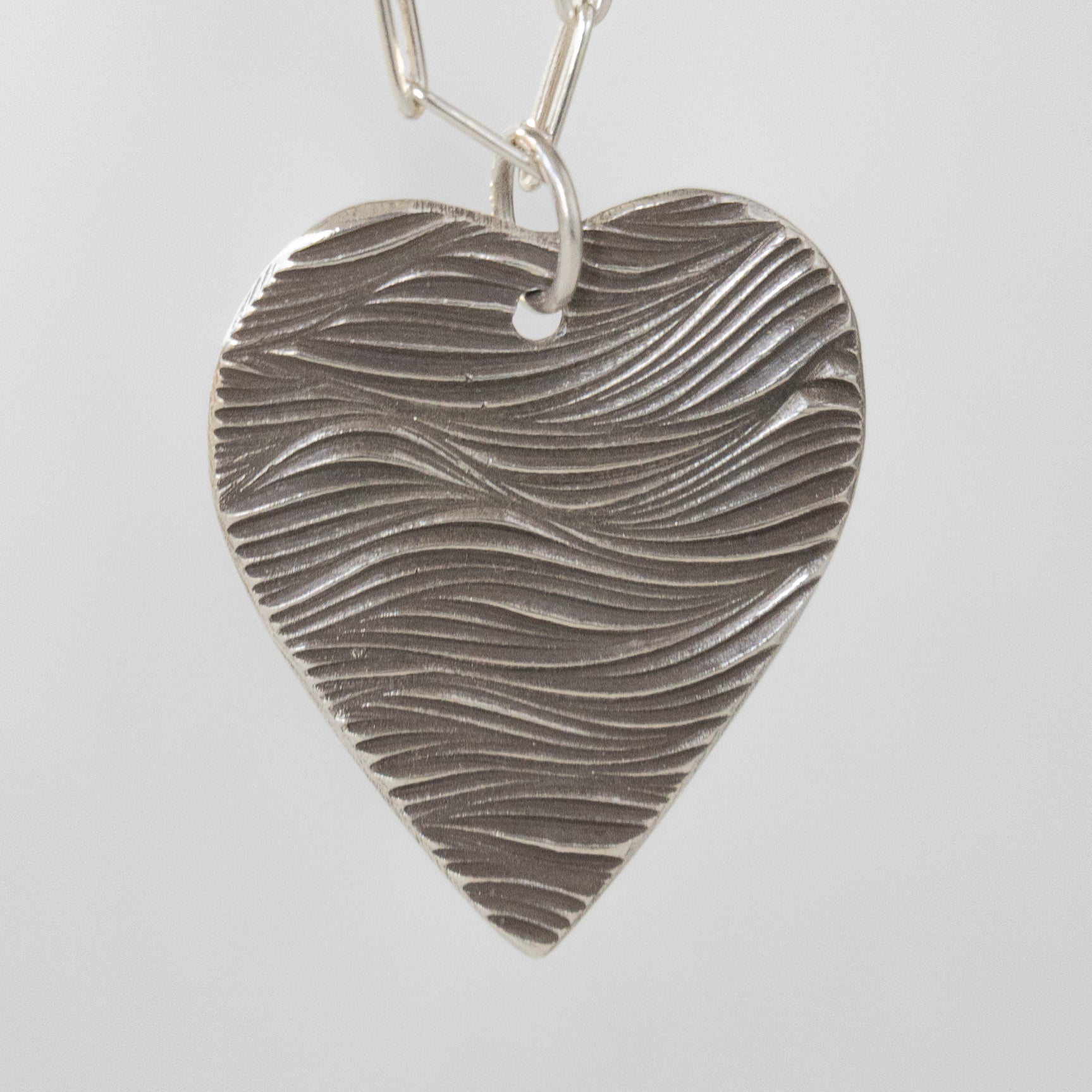 This elegant Heart Pendant is expertly crafted from silver and features a unique wave texture, adding a touch of modern sophistication. The prominent heart design makes it a perfect gift for your loved one or a stylish addition to any outfit. Add a touch of love and style to your look with this beautiful pendant.