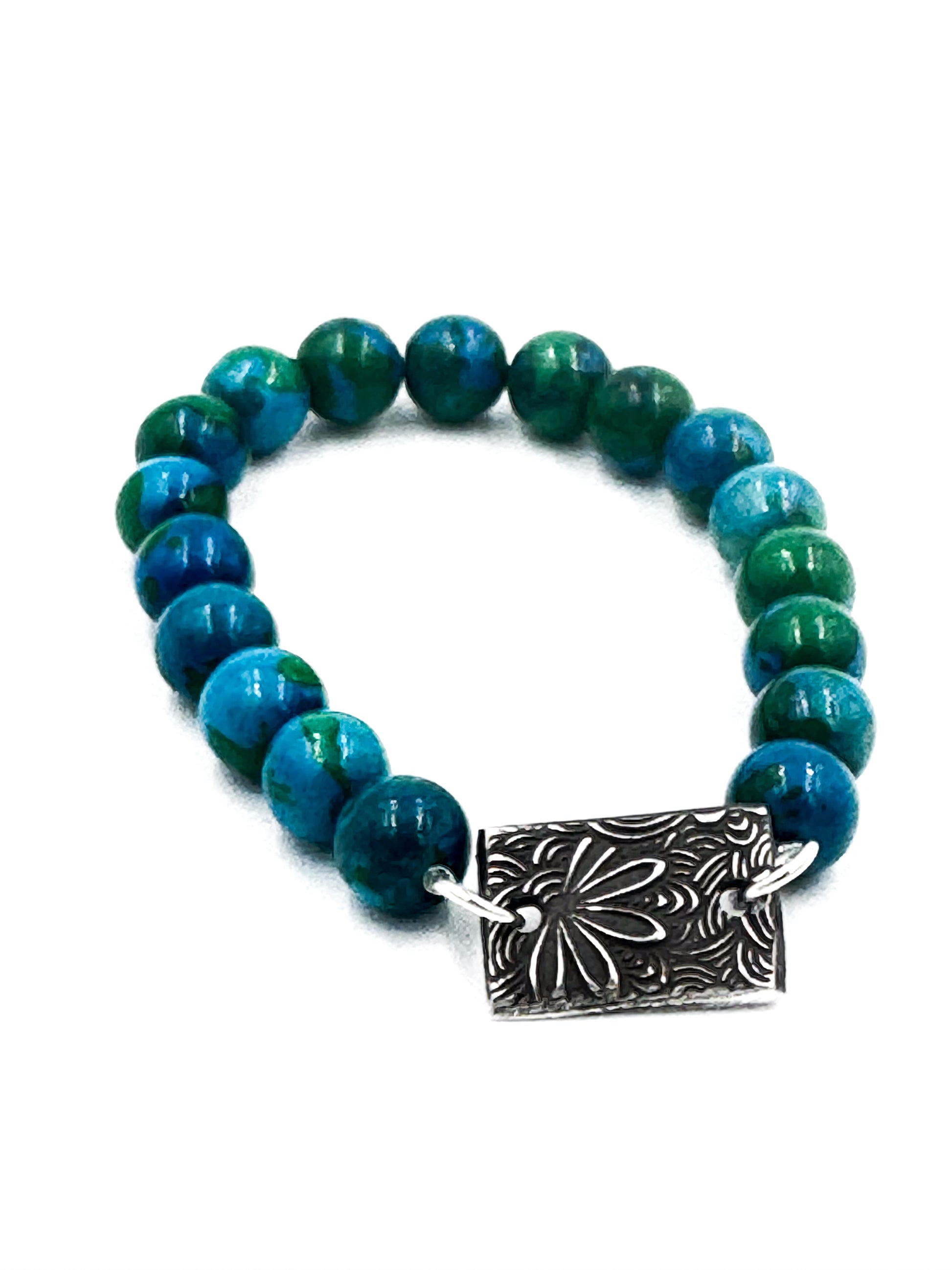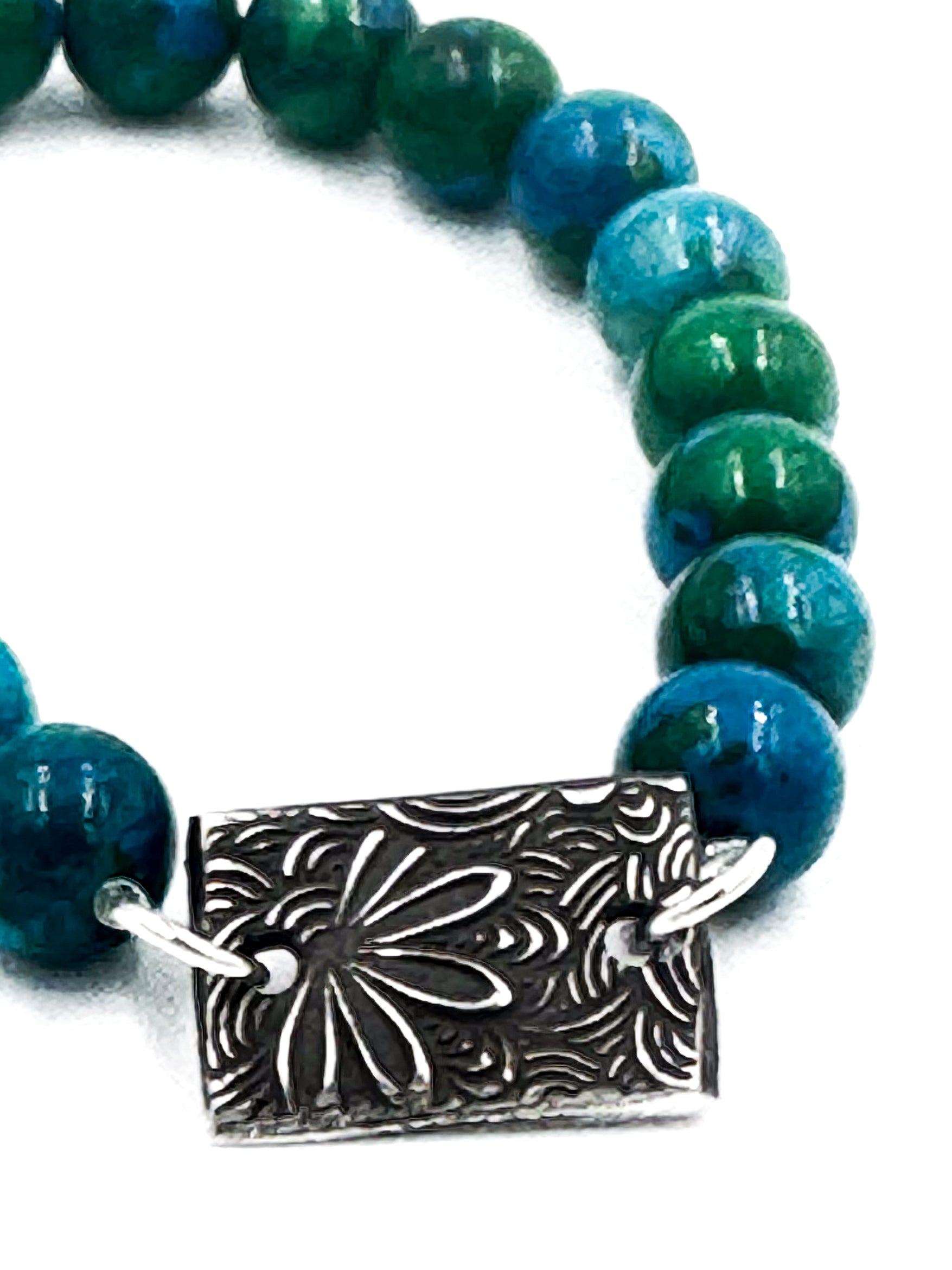 Upgrade your jewelry collection with our Howlite and Silver Bracelet. Made from high-quality materials, this bracelet boasts a sleek and elegant design perfect for any occasion. Howlite is known for its calming properties, making this bracelet not only a beautiful accessory but also a source of serenity. Add a touch of sophistication to your outfit with this stunning bracelet.